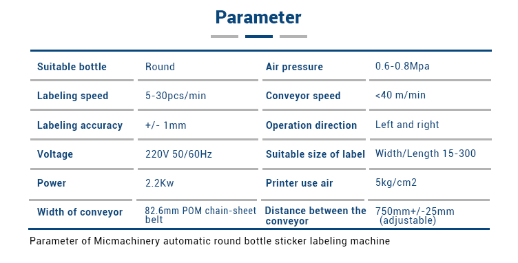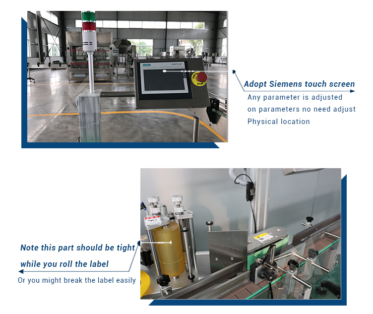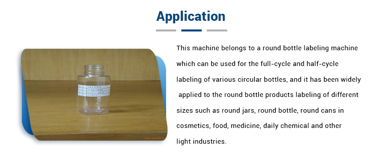 Ĉi tiu maŝino apartenas al ronda botelo-etikedilo, kiu povas esti uzata por la plen-ciklo- kaj duon-ciklo-etikedado de diversaj cirklaj boteloj, kaj ĝi estis vaste aplikita al la ronda botelo-etikedaj produktoj de diversaj grandecoj kiel ekzemple rondaj kruĉoj, rondaj boteloj , rondaj tukoj en kosmetikaĵoj, manĝaĵoj, kuraciloj, ĉiutagaj kemiaj kaj aliaj malpezaj industrioj. Ekipaĵa konsisto: Elektra kabineto, Konvena mekanismo, Aparta botelo-aparato, Ruliĝanta etiketa aparato, Brosela etiketa aparato, 1 # etiketanta motoro, Operacia sistemo kaj kontrolsistemo.